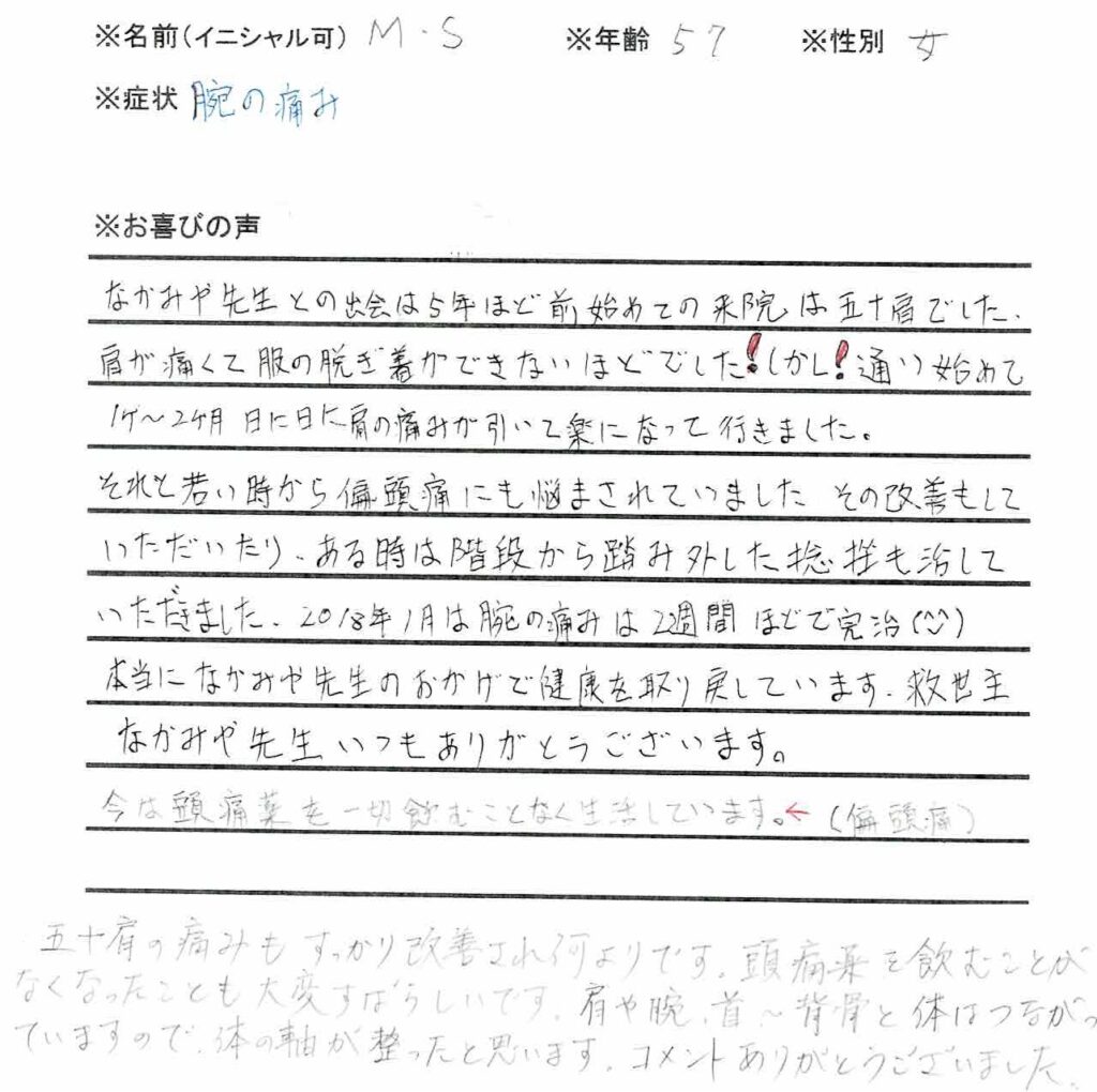 肩・肘・腕 2025.12.15 この度はお役に立てて光栄です。地味な治療でしたが「なんだか知らないうちに良くなってる~!」という感じでした。これからもウォーキングを続けてくださいね! 大好きな野球の練習でほぼ同時期に負傷してしまいました。肘も膝もいわゆる成長痛でしたが練習できない期間もいろいろと体を修復する体操と姿勢、とくに座り方をしっかり身につけて頂き、復帰することができました。本当によくがんばりました この度はお役に立てて光栄です。単に筋肉が固くなっているということではなく、頚椎の関節のトラブルとこれに伴う筋肉の炎症で回旋や側屈の痛みが出たように思われます。無事回復されなによりです! 五十肩の痛みもすっかり改善され何よりです。頭痛薬を飲むことがなくなったことも大変すばらしいです。肩や腕、首~背骨と体はつながっていますので、体の軸が整ったと思います。コメントありがとうございました。