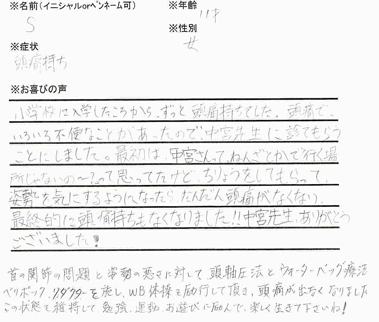 頭痛・肩こり 2025.12.15 首の関節の問題と姿勢の悪さに対して頭軸圧法といウォーターバッグの療法・ベリポック・リダクターを施し、WB体操を励行して頂き、頭痛が出なくなりました。この状態を維持して勉強・運動・お遊びに励んで、楽しく生きてくださいね!