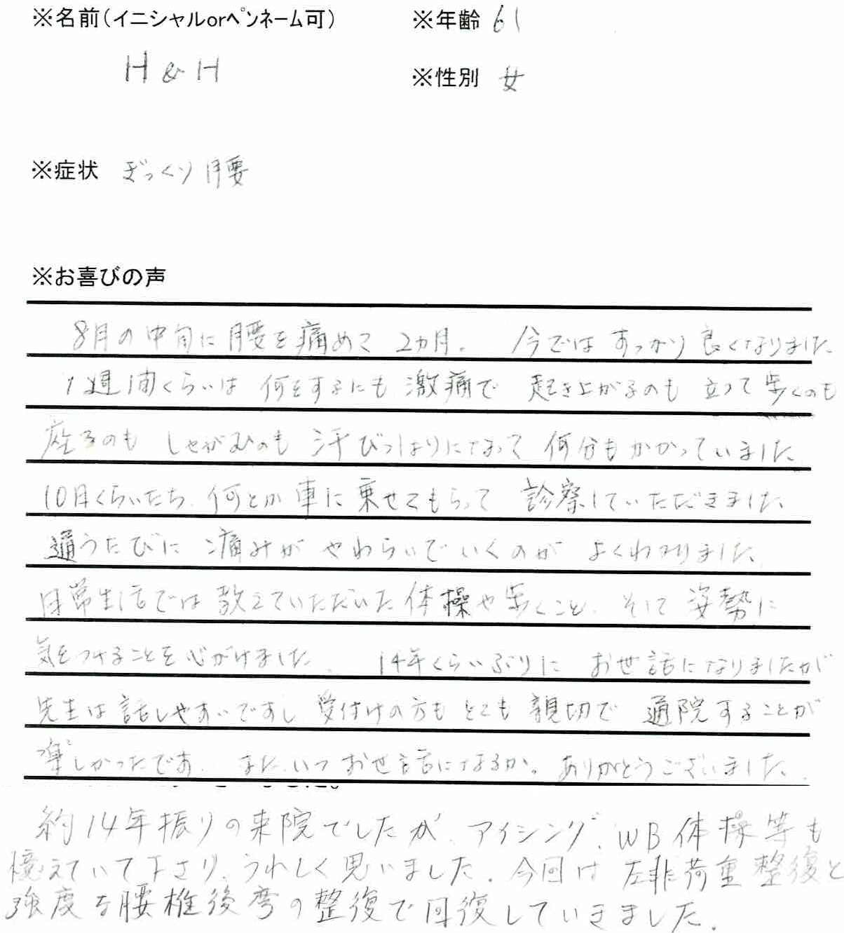 約14年振りの来院でしたが、アイシング・WB体操等も憶えていてくださりうれしく思いました。今回は左非荷重整復と強度な腰椎後弯の整復で回復していきました