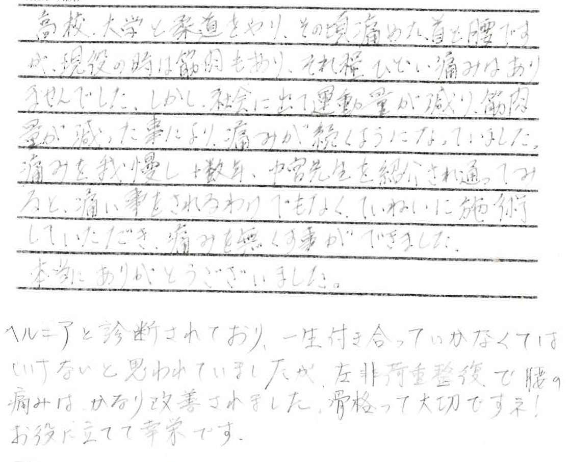 ヘルニアと診断されており、一生付き合っていかなくてはいけないと思われていましたが、左非荷重整復で腰の痛みはかなり改善されました。骨格って大切ですネ!お役に立てて光栄です。